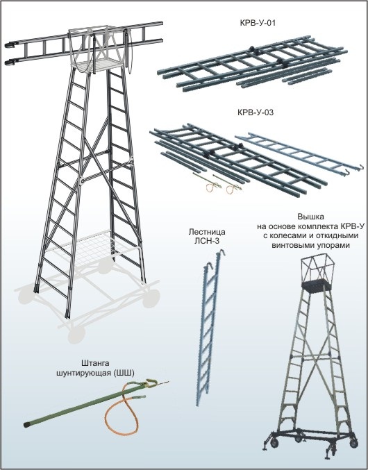 На основе комплекта КРВ-У может быть изготовлена вышка с рамой на поворотных колесах с откидными винтовыми упорами для обслуживания инженерных систем, освещения и коммуникаций на объектах железных дорог.