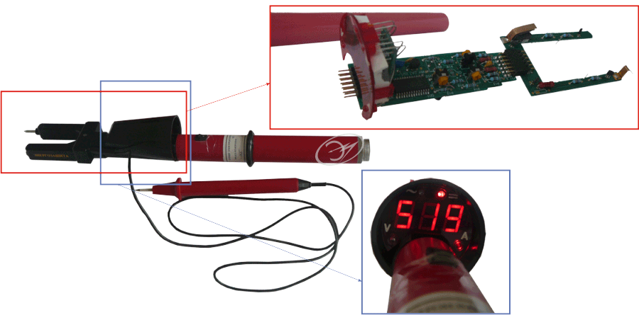 Индикация измеряемой величины и режима работы (переменное, постоянное, ток или напряжение) осуществляется посредством цифрового табло. Для определения величины постоянного и переменного тока воздушных линиях и распредустройствах 0.4-10 кВ, указатель комплектован изолирующей штангой с рукояткой, L=0.52м, а в комплекте с изолирующей многофункциональной 4-х звенной сборной штангой ШО-10-4-6,6 длиной 6,6 м, поставляемой по заказу потребителя за отдельную плату, указатель позволяет определить величину тока на линиях электропередач 0.4-10 кВ, без подъема на опору ВЛ, непосредственно с поверхности земли.