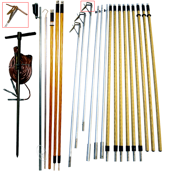 Для заземления проводов  в комплекте предусмотряны  три 5-и звенные заземляющие штанги с захватами.Каждая заземляющая штанга состоит из металлического звена с захватом , металлического звена , 2-х изолирующих звеньев и одного  изолирующего звена с рукояткой.