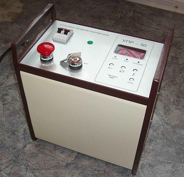 УПР-30 ) предназначена для проверки напряжения срабатывания высоковольтных разрядников серии РВС, РВО-6, 10 в автоматическом режиме с фиксацией напряжения пробоя .