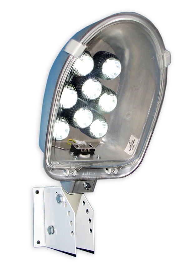 Светильник выполнен на 8 светодиодных лампах мощностью по 4 Вт каждая, с собственными радиаторами. Лампы установлены на общую алюминиевую панель полуовального профиля. Лампы крепятся внутри алюминиевого рефлектора через теплопроводящий компаунд, имеющий плотный тепловой контакт с верхней поверхностью рефлектора. Внутри корпуса светильника установлена соединительная колодка, к которой подключены однофазная электрическая сеть и провод заземления. Сетевые провода выведены через герметизированную втулку и металлическую крышку на верхнюю поверхность рефлектора. Для соединения с сетью использован кабель с резиновой изоляцией длиной 75 мм. Кабель заканчивается лужеными концами, к которым подключаются сетевые провода. Нижняя часть рефлектора закрыта стеклом со специальным стягивающим хомутом с уплотнительной резиновой прокладкой. Стекло прижимается к рефлектору с помощью откидных замков. Светильник комплектуется специальным кронштейном для установки на стенах и иных вертикальных поверхностях. С помощью отверстий в кронштейне имеется возможность устанавливать требуемый угол излучения через каждые 15° (15° х 6). Для установки на стандартные столбы с консолями кронштейн не нужен. Его заменяет труба диаметром 40 мм. Перечисленные конструктивные решения обеспечивают светильнику пыле-брызгозащищенное исполнение класса IP54.