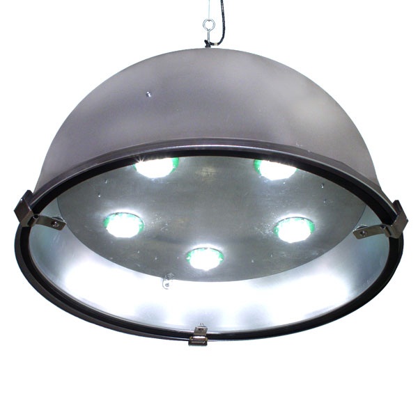 Прожектор выполнен на 5 светодиодных модулях (кластерах). Кластеры размещены на общем алюминиевом основании. Сборка кластеров с основанием крепится в алюминиевом рефлекторе диаметром 490 мм, высотой 300 мм. Питание светильников осуществляется от однофазной электрической сети 220В, 50-60 Гц, с помощью соединительной колодки. Для соединения с сетью использован кабель с резиновой изоляцией. Кабель заканчивается лужеными концами, к которым подключаются сетевые провода. Нижняя часть рефлектора закрыта стеклом со специальными стягивающими замками и уплотнительной резиновой прокладкой. Светильник имеет пыле-брызгозащищенное исполнение класса IP54. Для подвески светильника к потолку на его верхней крышке имеется крюк.
